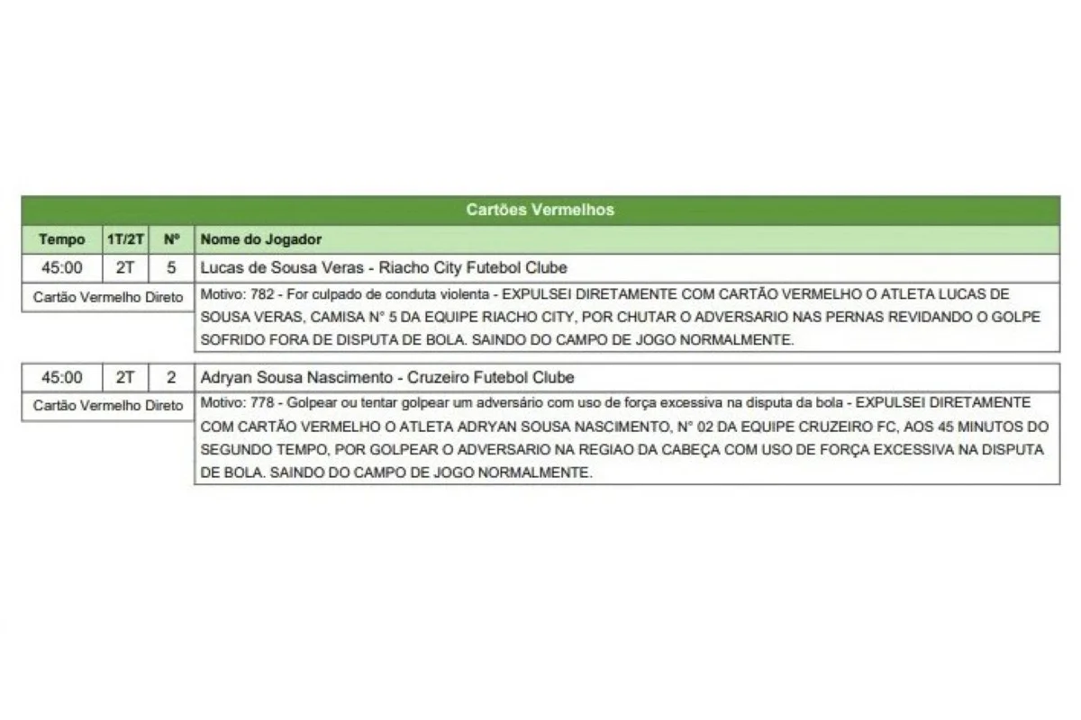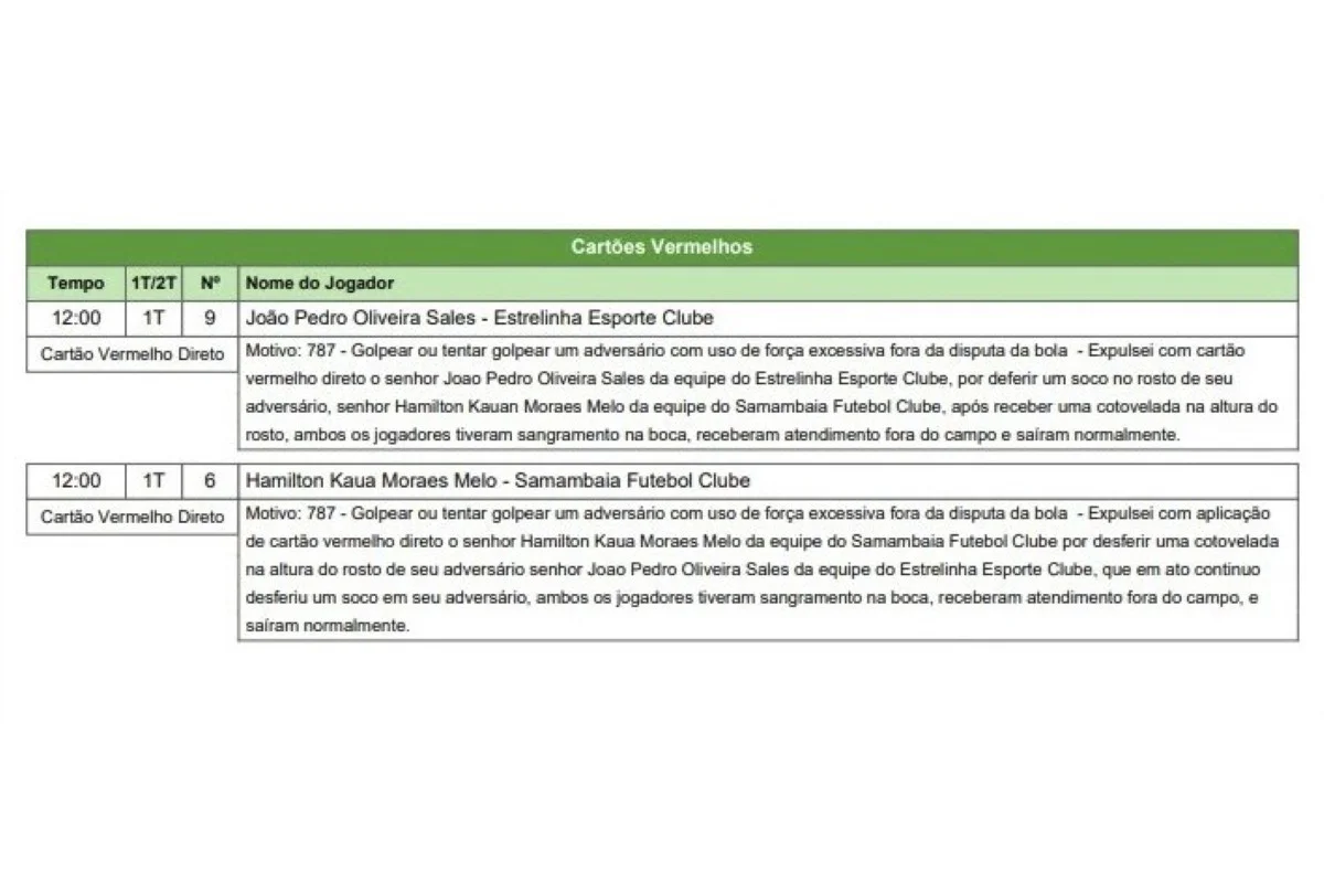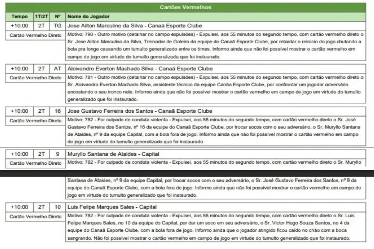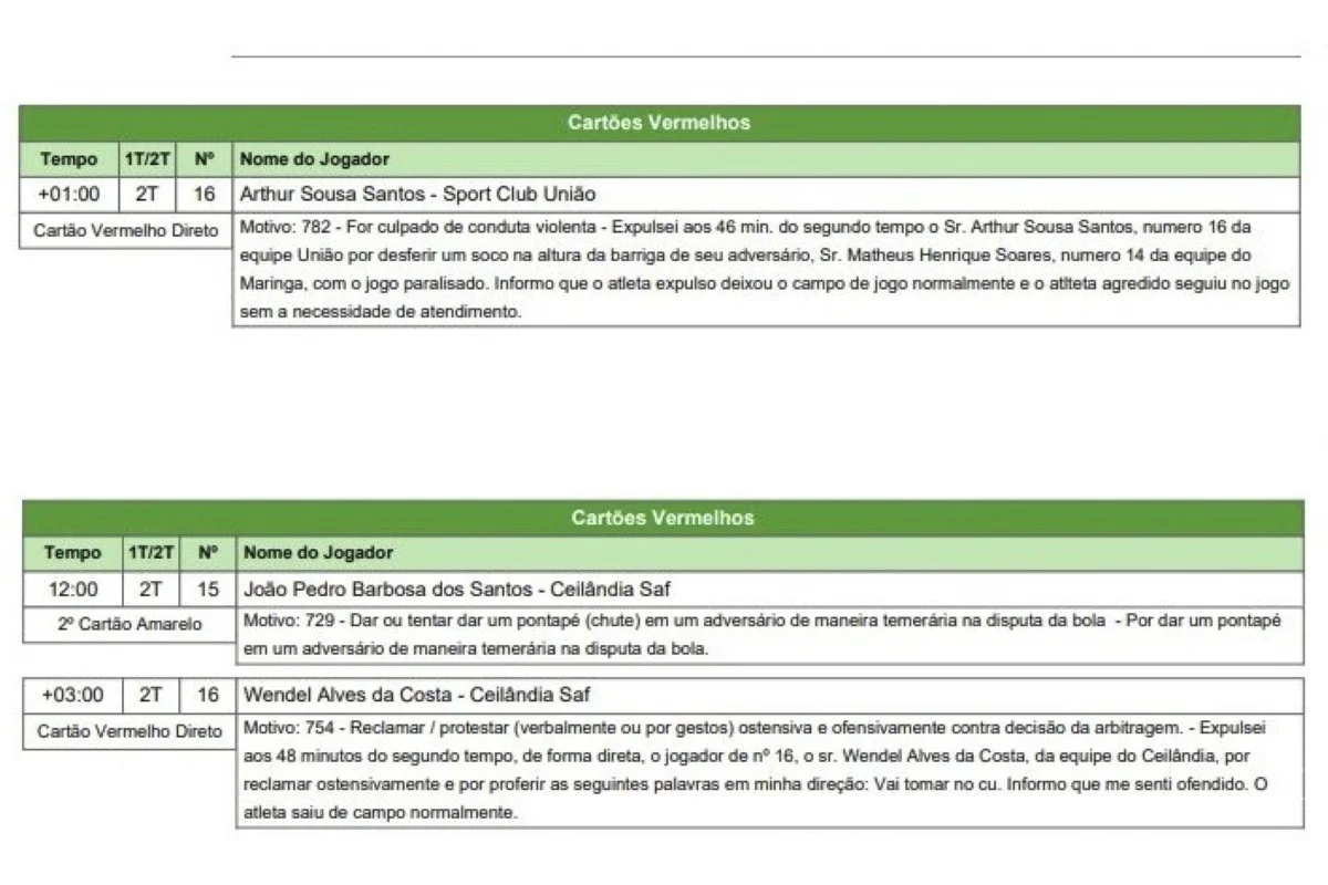 Somando as temporadas 2024 e 2025, a equipe do Sobradinho lidera a lista de clubes com mais expulsões: foram sete somente no ano passado. Neste ano, o time atuou em apenas um jogo, antes de ser eliminado por W.O.