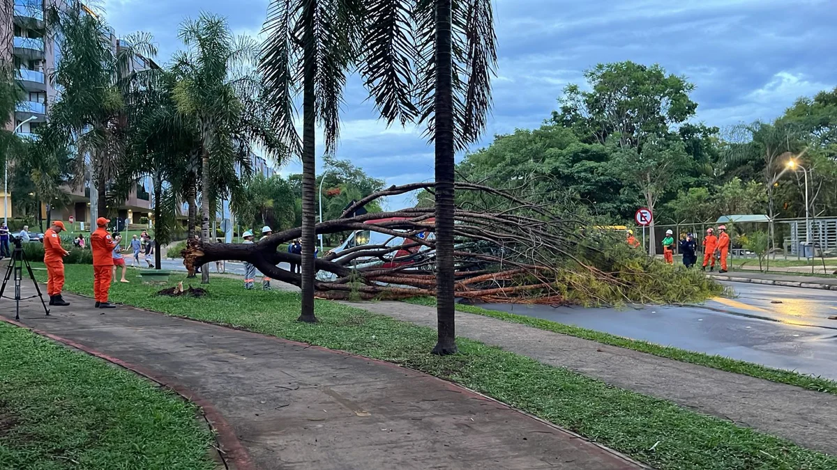 Segundo o Corpo de Bombeiros (CBMDF), o fato ocorreu após uma árvore cair e atingir o poste, que caiu em cima do veículo.