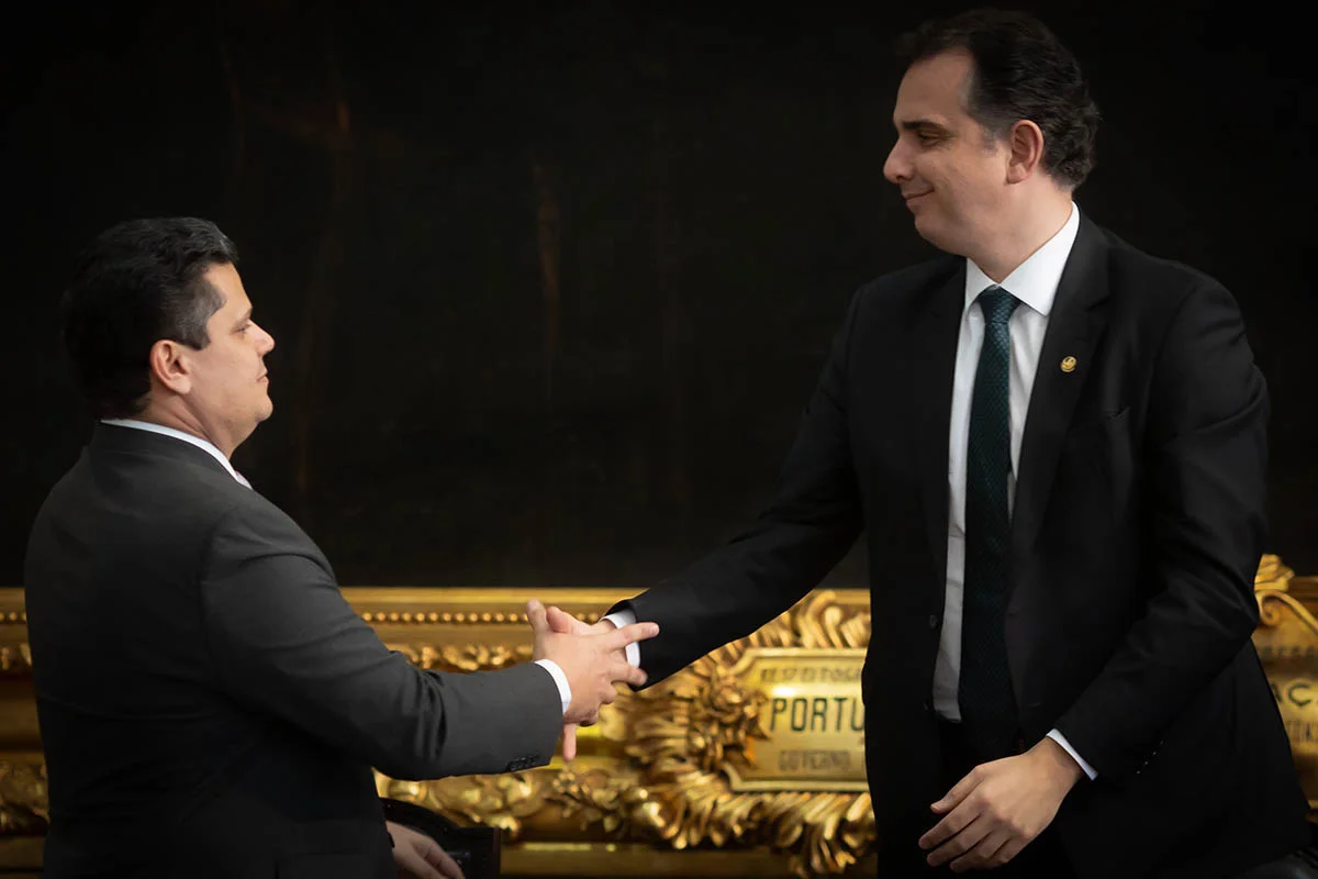 Brasília(DF), 24/05/2023. Presidente do Senado Rodrigo Pacheco cumprimenta o Senador Davi Alcolumbre durante a cerimônia. Senado atualiza galeria de presidentes e repõe quadros depredados nos atos de vandalismo ocorridos no dia 8 de janeiro.