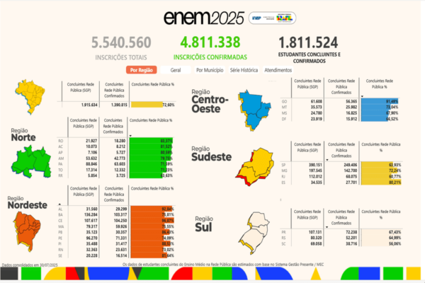 O Distrito Federal teve 66,5% dos concluintes da rede pública com inscrição confirmada no Enem 2025, segundo dados divulgados pelo Instituto Nacional de Estudos e Pesquisas Educacionais Anísio Teixeira (Inep) em 30 de julho. O percentual é o mais baixo da Região Centro-Oeste e um dos menores entre todas as unidades da federação.