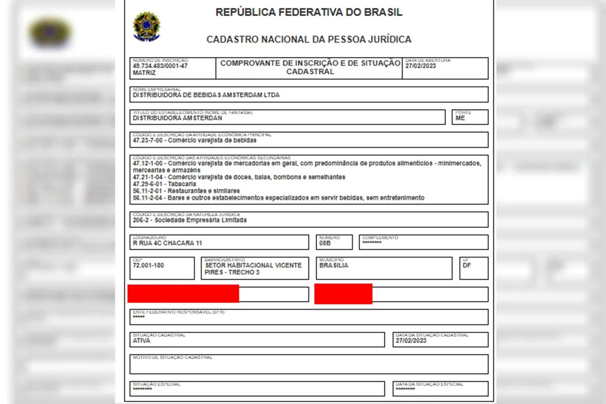 A distribuidora de bebidas que forneceu vodca supostamente adulterada para o cantor Gustavo Hungria não tinha o licenciamento para funcionar. De acordo com o CNPJ da distribuidora Amsterdan na Rede Sim do Governo do Distrito Federal, o estabelecimento sequer iniciou com as documentações necessárias para regularizar a situação. Veja: