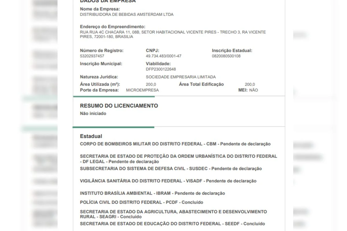 Pela Rede Sim, a empresa não apresentou declaração ao Corpo de Bombeiros, à DF Legal, à Defesa Civil, à Vigilância Sanitária e ao Instituto Brasília Ambiental (Ibram). Ainda assim, o estabelecimento funciona desde fevereiro de 2023, conforme constam os dados cadastrais na Receita Federal.