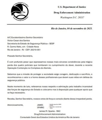 Em seu posicionamento, o parlamentar autoexilado nos EUA publicou a carta e, ao lado, uma manchete de reportagem do Metrópoles, informando que o governo Lula discute auxílio a familiares de mortos no RJ. Ao todo, 121 suspeitos foram mortos durante a megaoperação policial realizada pela administração de Cláudio Castro no Rio de Janeiro.