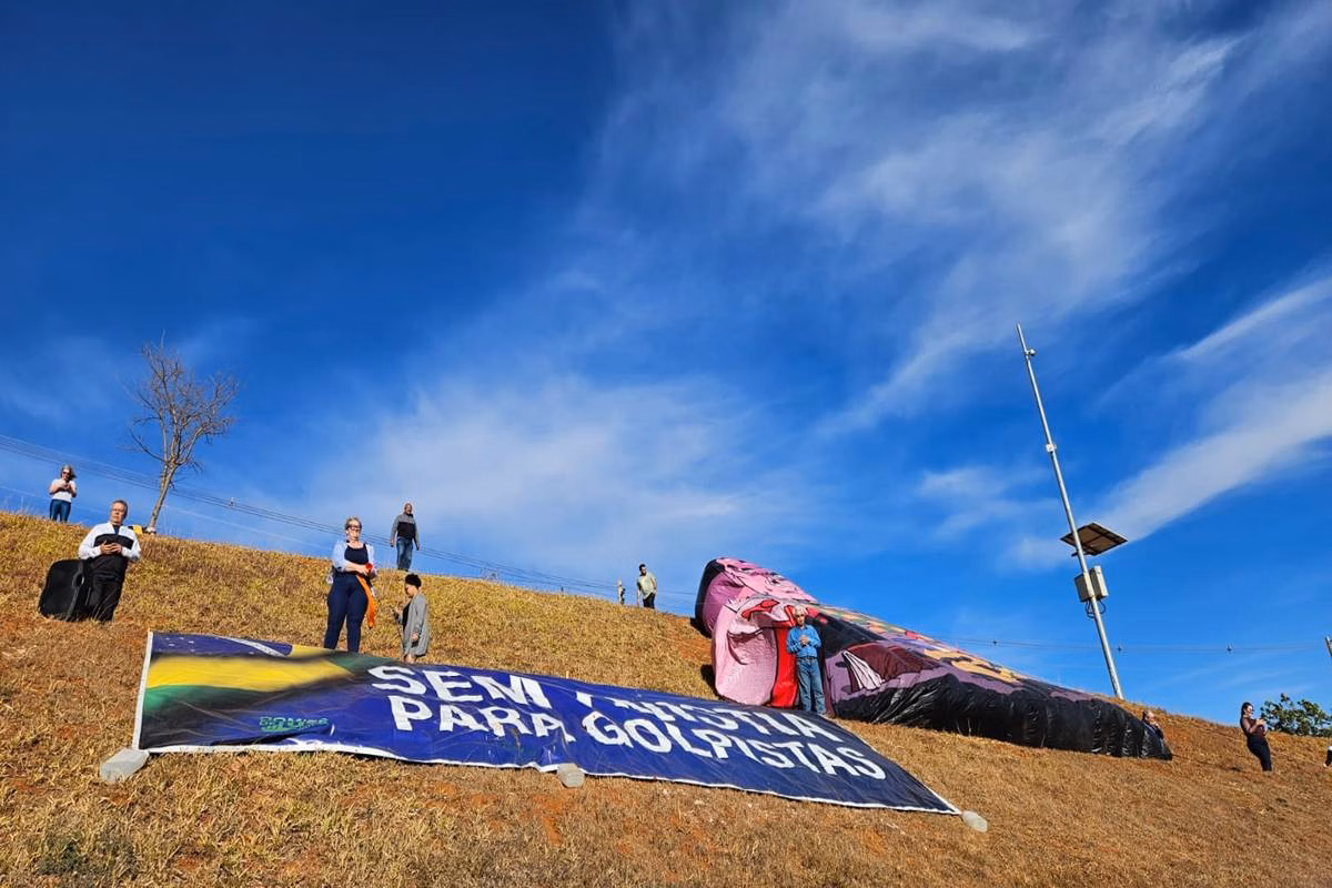 No local, o grupo inflou um boneco gigante de Bolsonaro. Ao lado, uma faixa com os dizeres “Sem anistia para golpistas” reforçou a mensagem do protesto.