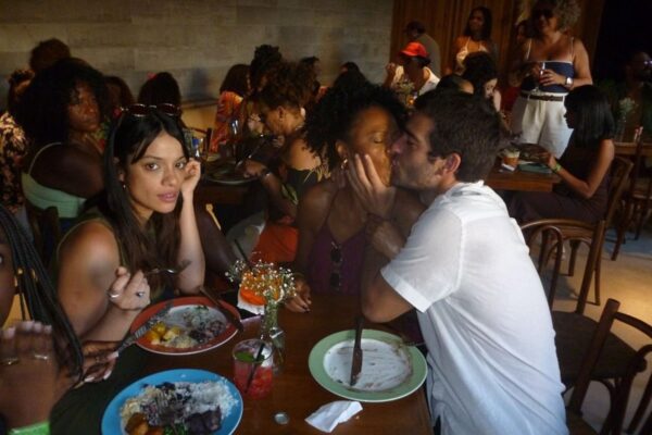 Em uma foto compartilhada pela atriz Ingrid Gaigher, intérprete de Lucimar, Humberto aparece dando um beijo em Edvana Carvalho. A atriz dá vida à costureira Eunice, madrasta de Ivan (Renato Góes).