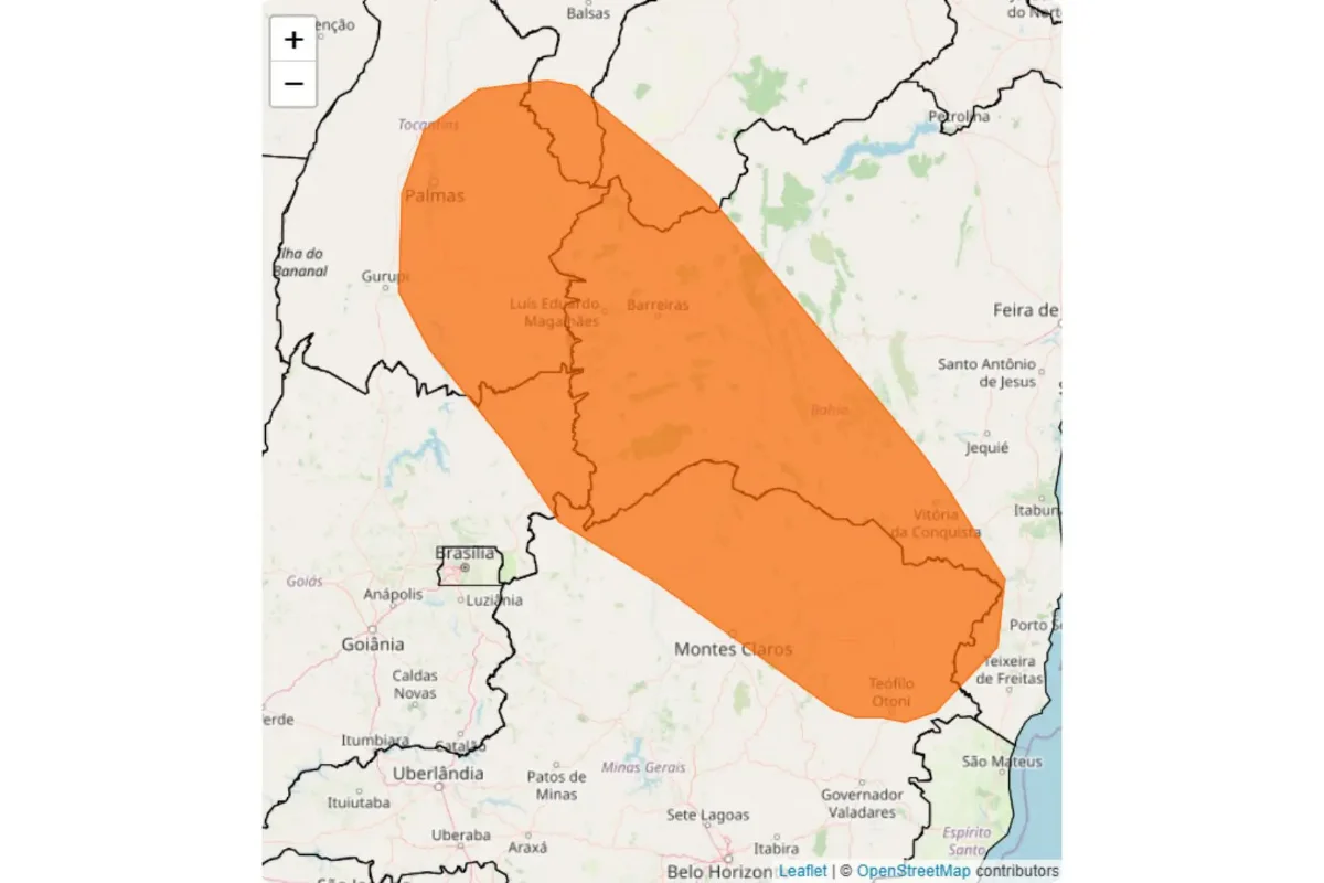 O segundo alerta, também por tempestade, atinge Tocantins, Maranhão, Piauí, Bahia, Minas Gerais e Goiás.