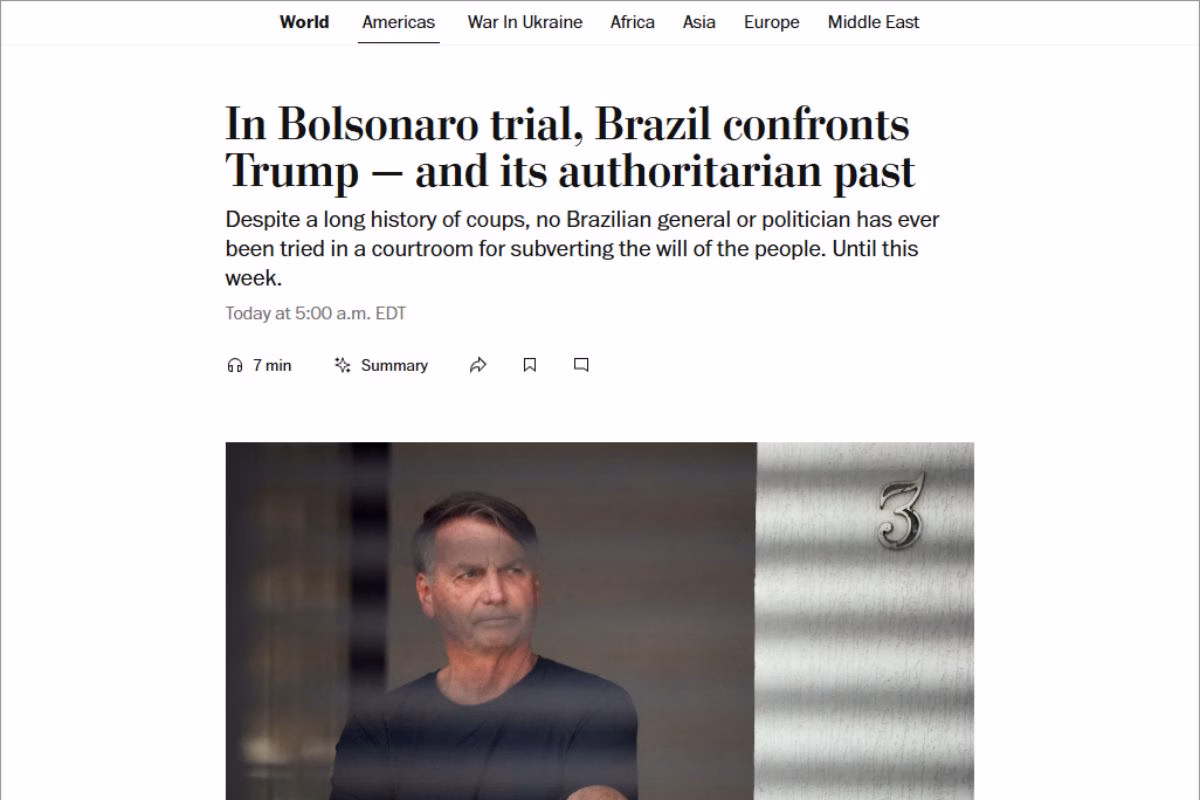 Já no The Washington Post, uma reportagem de título “No julgamento de Bolsonaro, o Brasil confronta Trump — e seu passado autoritário”, publicada nesta segunda, analisa como o julgamento de Jair Bolsonaro pelo Supremo Tribunal Federal (STF) representa um momento histórico para o Brasil, sendo o primeiro caso em que um ex-presidente é processado por tentativa de subversão democrática.