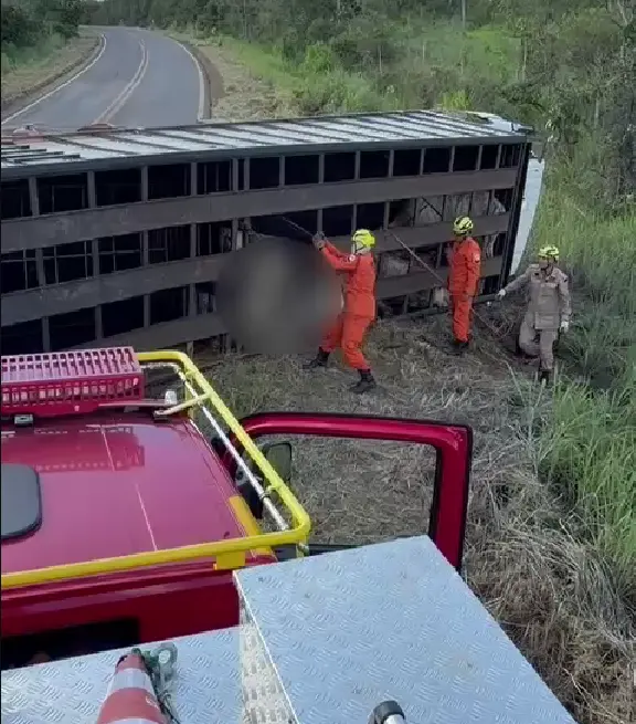 No momento do acidente, a carreta transportava 22 bois. Após o tombamento, equipes realizaram um trabalho técnico para abrir a estrutura do compartimento de carga, conhecido como “gaiolona”, permitindo o resgate dos animais que estavam presos no veículo.