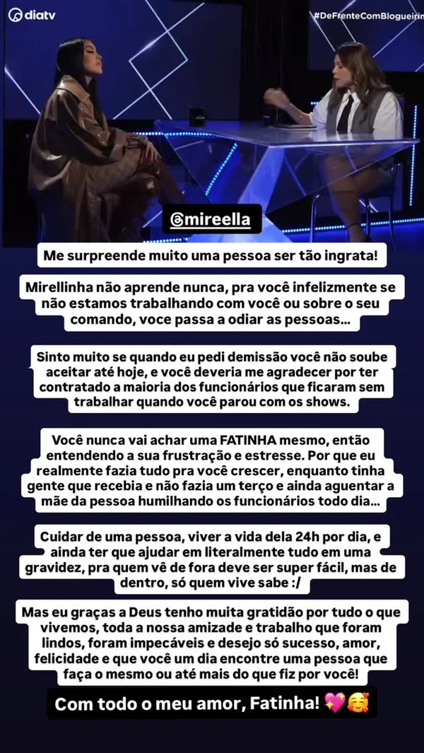 Após a fala da cantora, Fatinha, que fez parte da equipe de MC Mirella, publicou um texto nas redes sociais. Em um longo desabafo, a ex-assistente acusou a artista de ingratidão e de não aceitar pedidos de demissão.