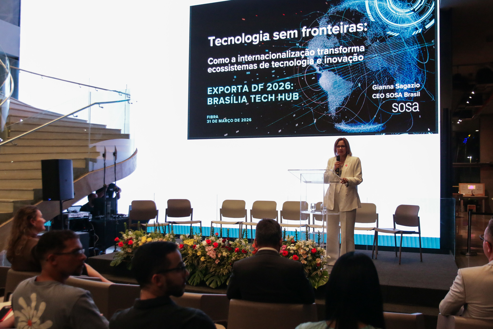 Na segunda palestra, a CEO da empresa SOSA Brasil, Gianna Sagazio, falou sobre o papel da internacionalização na transformação de ecossistemas de tecnologia. Para a executiva, a internacionalização é a principal estratégia para que empresas conquistem novos mercados e se insiram nas cadeias globais de valor.