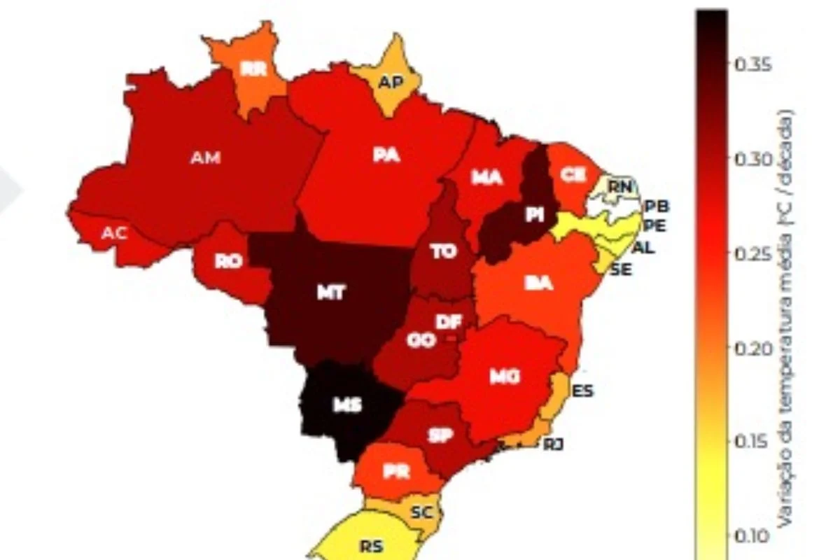 Ainda de acordo com os dados, Mato Grosso do Sul, Mato Grosso e Piauí foram os estados que registraram um maior aumento gradativo da temperatura no decorrer dos anos, com taxas variando entre 0,34 e 0,40º C a década.