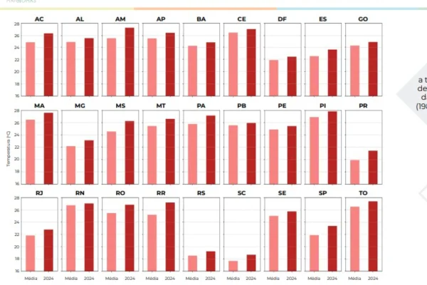 Ainda de acordo com os dados, Mato Grosso do Sul, Mato Grosso e Piauí foram os estados que registraram um maior aumento gradativo da temperatura no decorrer dos anos, com taxas variando entre 0,34 e 0,40º C a década.